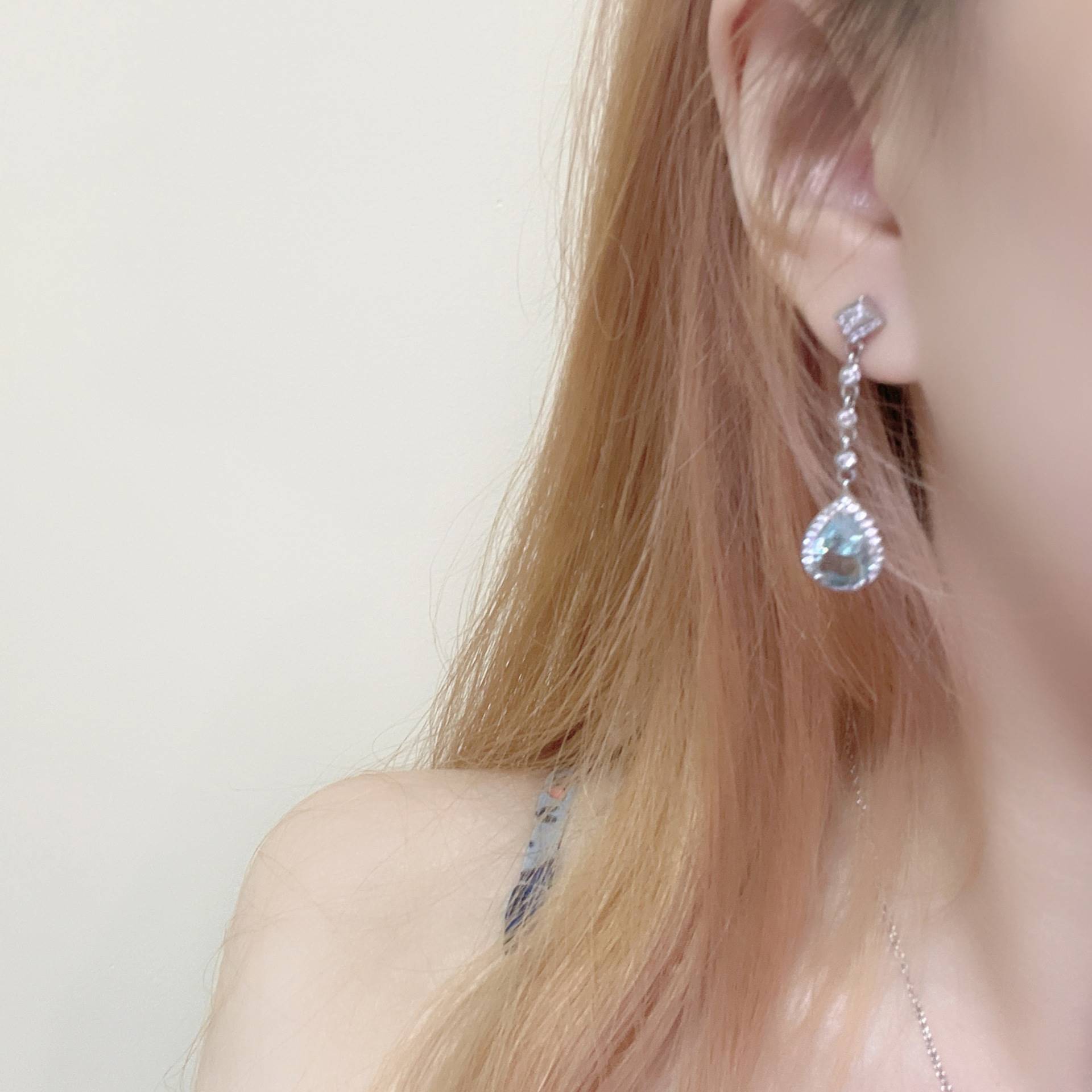 Color: Aquamarine necklace, aquamarine stud earrings, aquamarine suit